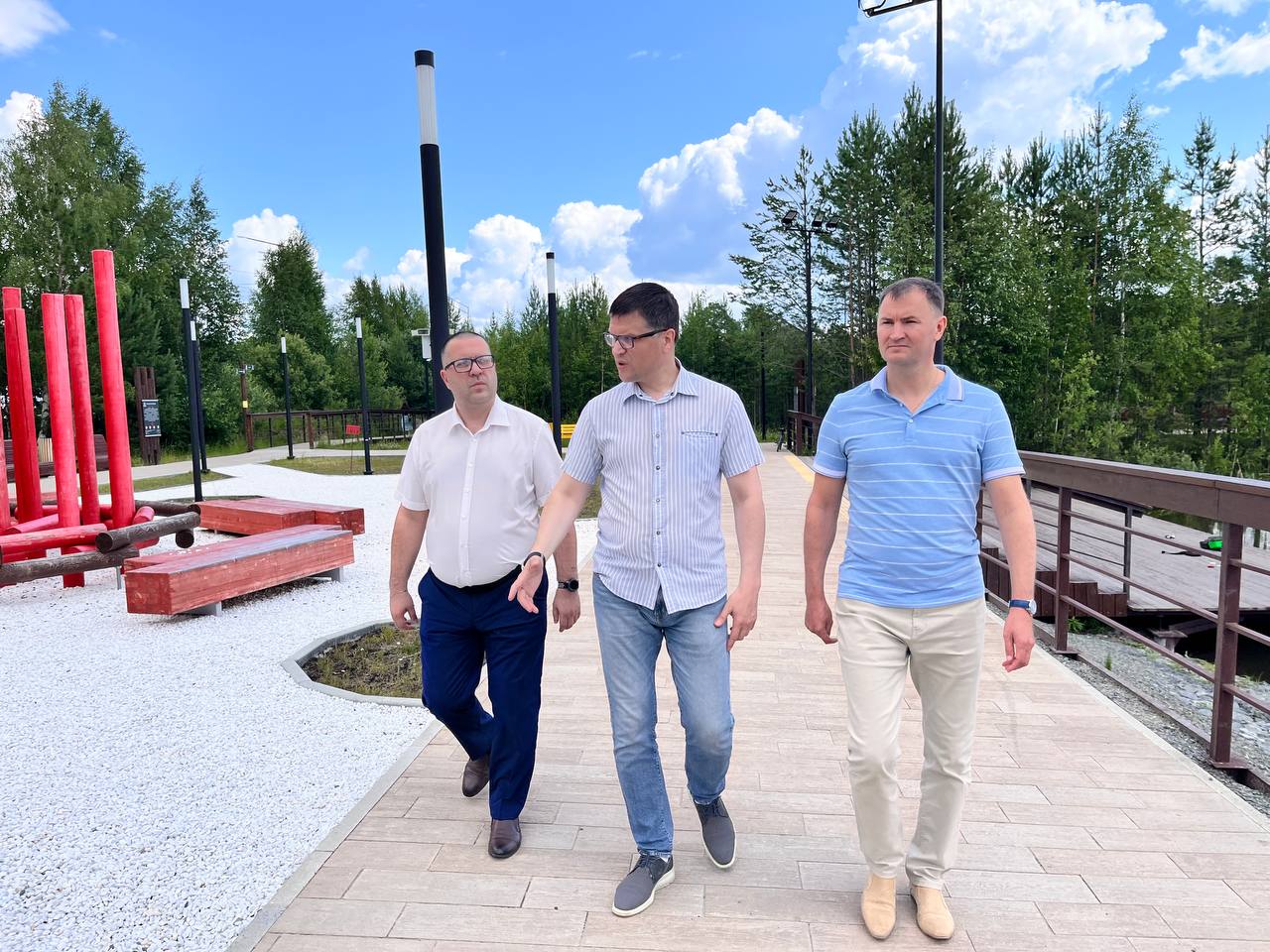 По окончании рабочей встречи вместе осмотрели Озёрный парк «Картопья». Этот проект комфортной городской среды из Югры глава муниципалитета представлял на всероссийском форуме «Малая Родина — сила России», ставший в 2021 году победителем всероссийского конкурса лучших проектов создания комфортной городской среды в малых городах и исторических поселениях. В результате инициативы советчан в августе 2023 года появилась рекреационная зона – этот озерный парк площадью 12 гектаров. Он соединил центральную часть города с микрорайоном Картопья, появилось общественное пространство для длительных прогулок: спортивные игровые зоны, зона барбекю, площадка с уличными батутами и высокими качелями, открытый лекторий, пешеходный мостик через водоём, тематические зоны, посвященные традициям и самобытности народов Севера. Отличительная особенность парка в том, что многие элементы благоустройства сделаны из природных материалов. Идею реализовали в рамках нацпроекта «Жилье и городская среда», преемником которого стал нацпроект «Инфраструктура для жизни».