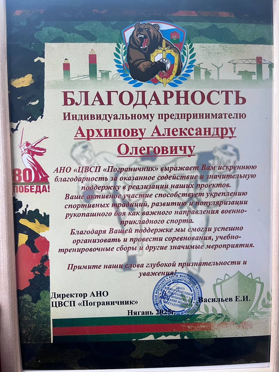 В знак признания его активной работы в сфере поддержания спорта и молодежных инициатив, организаторы спортивного турнира по рукопашному бою вручили Александру Архипову благодарственное письмо за плодотворное сотрудничество и личную поддержку.