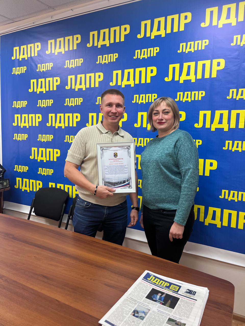 В общественную приемную партии пришла посетительница и вручила от лица главы Нягани благодарность Александру Архипову, координатору местного отделения ЛДПР за финансовую помощь и личный вклад в реализацию проекта " Обустройство учебно-тренировочного полигона для начальной военной подготовки".